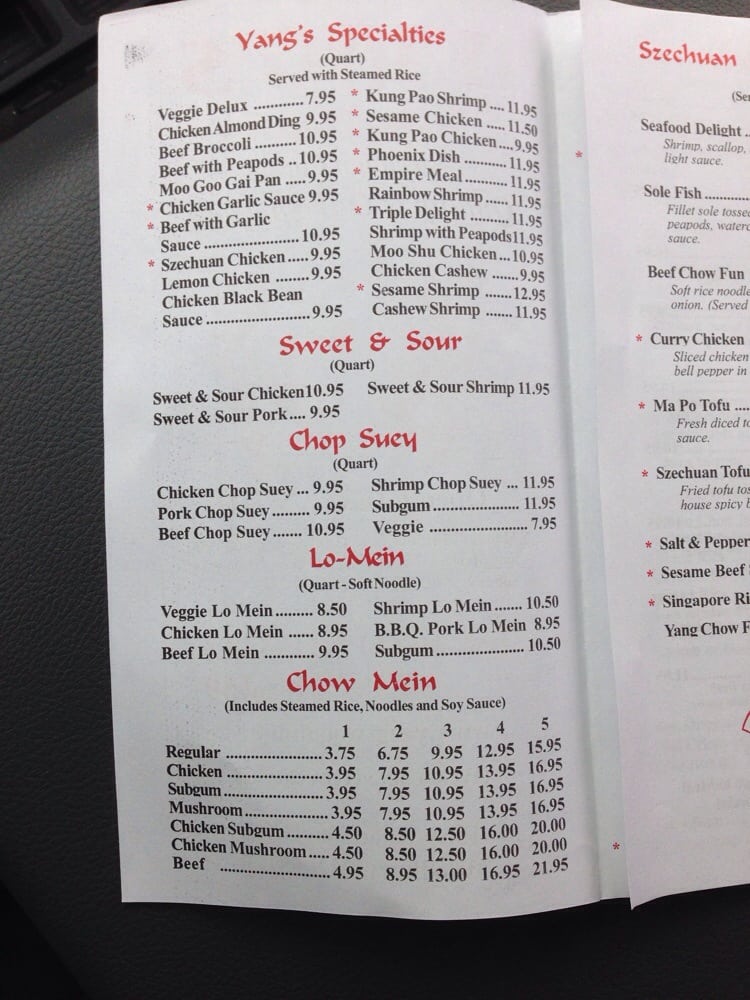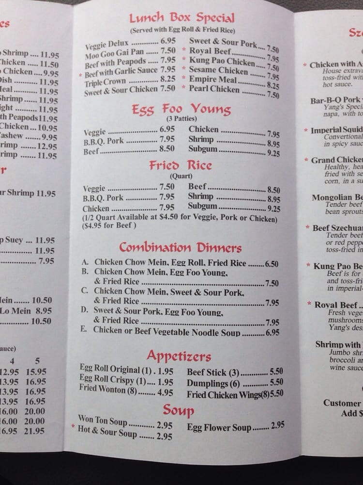 Yang's Chinese Restaurant in Woodbury, MN offers a diverse menu featuring appetizers like Egg Rolls and Fried Wonton, soups like Hot & Sour Soup, and a variety of Egg Foo Young options. The restaurant provides a casual dining experience with options for takeout, delivery, and catering. Customers praise the speedy service and fair prices, with favorites including Kong Pow Chicken and Sesame Chicken. While some dishes like Egg Rolls may not impress all customers, the quality of the main dishes like Ma Po Tofu and Egg Foo Young shines through. The cozy atmosphere and consistent quality make Yang's a family favorite, with loyal customers returning for the flavorful and satisfying Chinese cuisine.